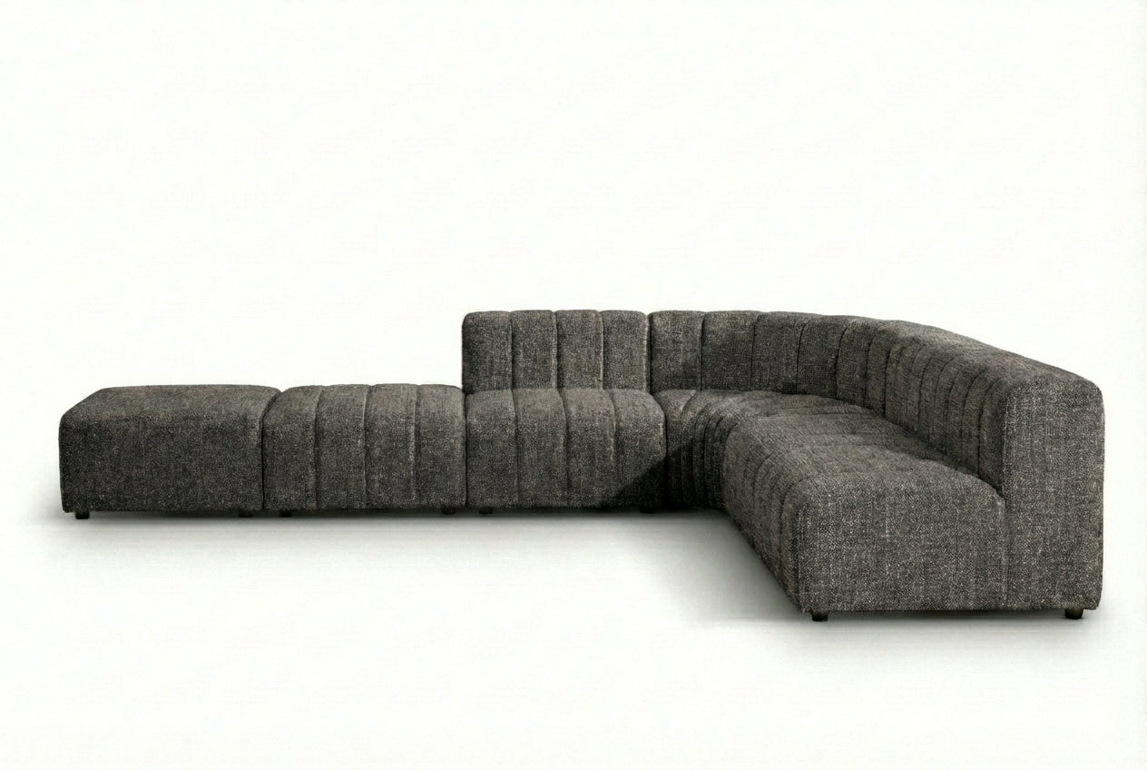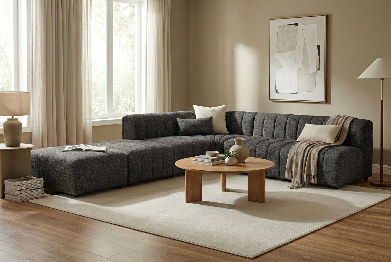 The Leo Corner Sofa with Ottoman in Cinder is designed for homeowners who appreciate bold contemporary style and adaptable living spaces. Its spacious sectional design, deep cushions, and striking charcoal upholstery create a statement centrepiece that combines comfort, practicality, and modern sophistication.