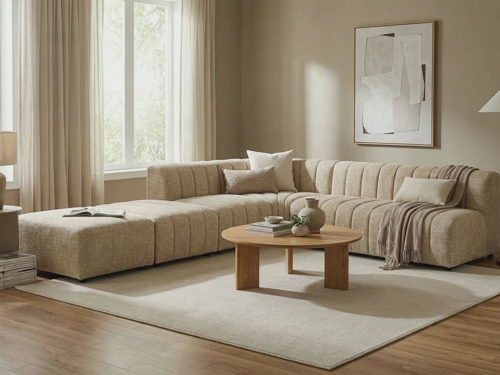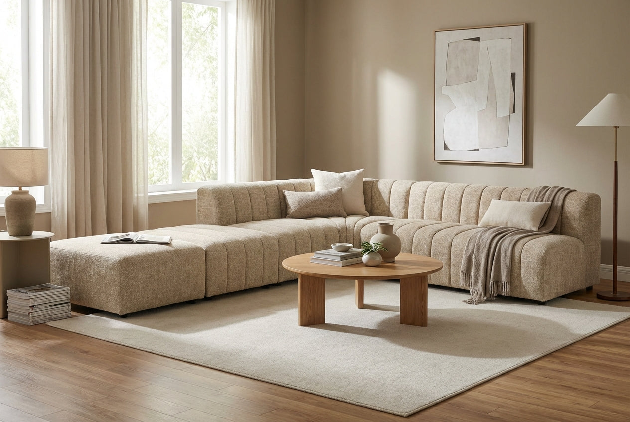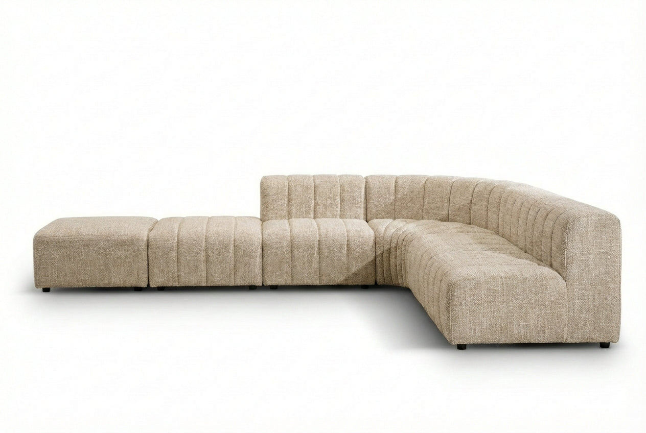 Upgrade your living space with the Araco Atelier Leo Corner Sofa with Ottoman Wicker, a sophisticated blend of contemporary design, generous seating, and versatile functionality. Upholstered in warm Wicker fabric, this corner sofa introduces a natural, earthy tone that brings warmth and depth to modern interiors while creating a comfortable and inviting focal point for your living room.