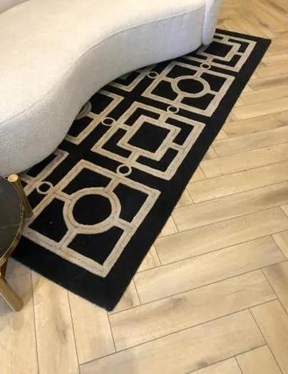 Crafted by renowned luxury brand Eichholtz, this carpet features a deep black tone with subtle texture, bringing depth and elegance to your living room, bedroom, or office. Its generous size and plush feel make it both a visual statement and a cosy addition underfoot.