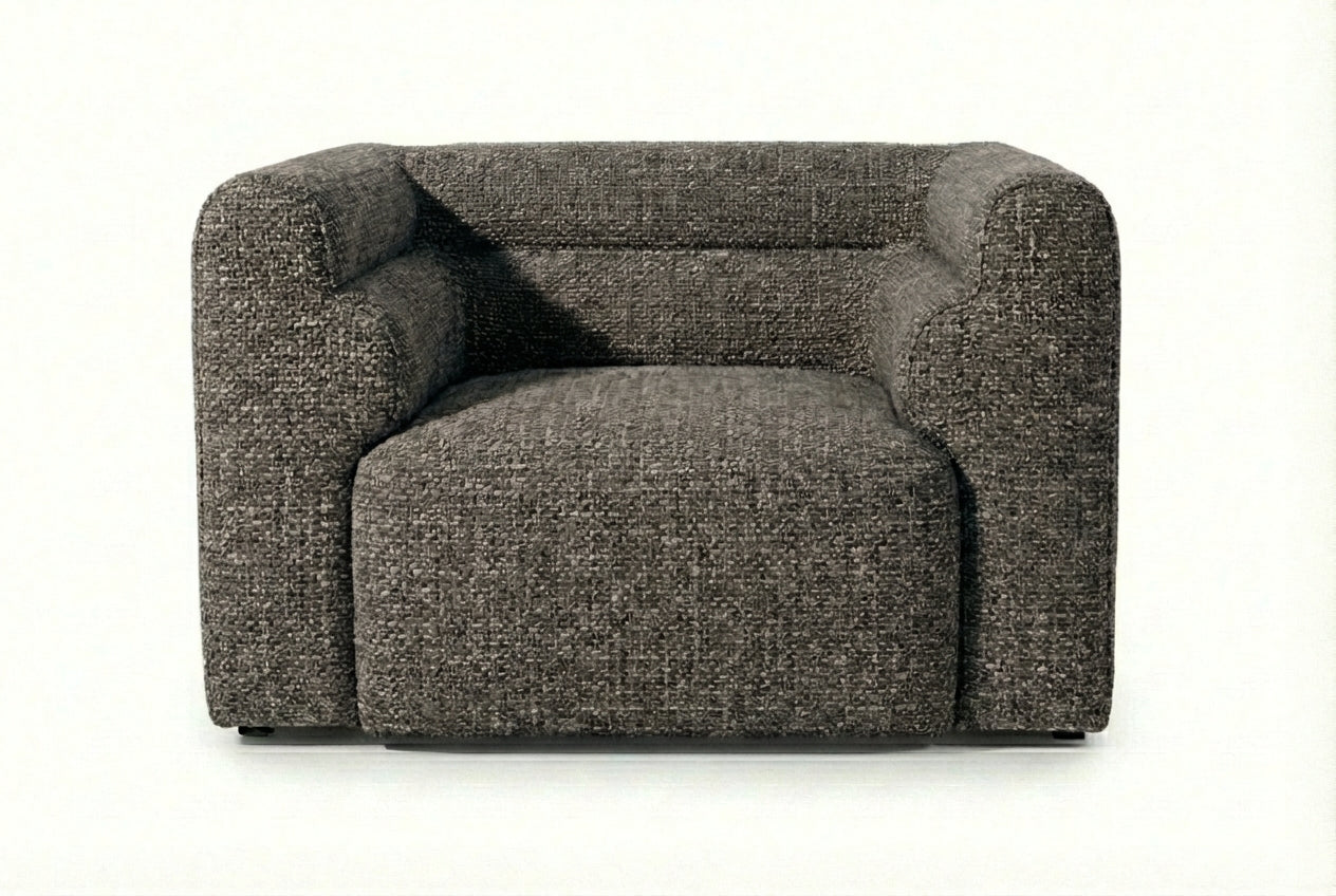 The Bear Armchair features a sculptural silhouette with soft curves and generously padded cushioning designed for relaxed everyday comfort. Its Cinder upholstery offers a refined charcoal shade with subtle texture, giving the chair a striking yet versatile presence that works beautifully in contemporary, minimalist, or industrial-inspired spaces. The supportive backrest and plush seat make it ideal for reading, relaxing, or complementing your main sofa seating.