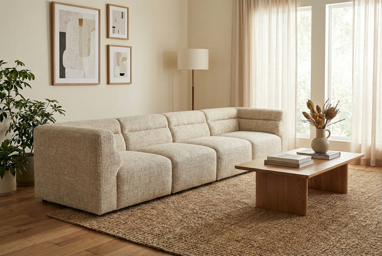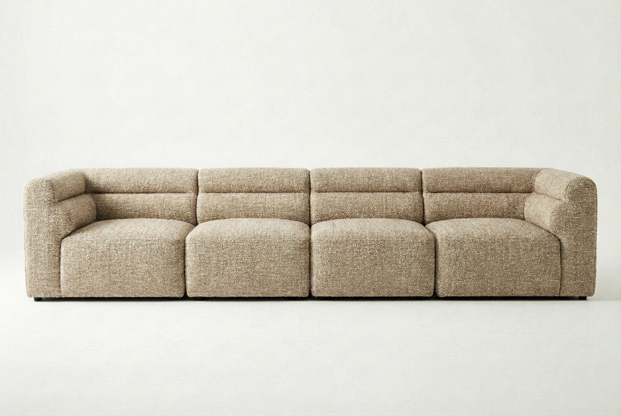 The Atlas 4-Seater Sofa in Wicker is designed for those seeking a refined, functional centerpiece. Its sculptural silhouette, comfortable cushions, and warm neutral fabric make it an adaptable addition to a wide range of living spaces.