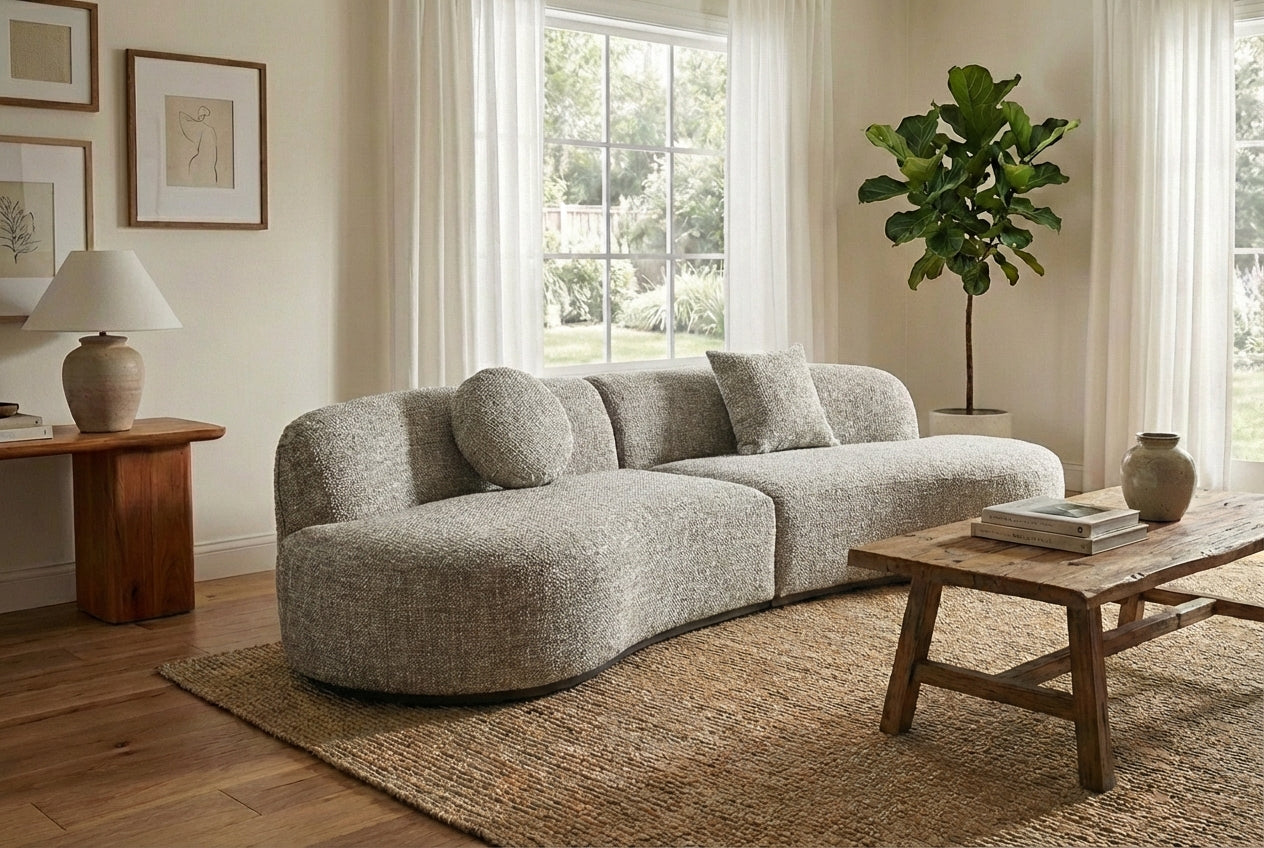 Add cushions in charcoal, cream, or muted blues for a layered modern look