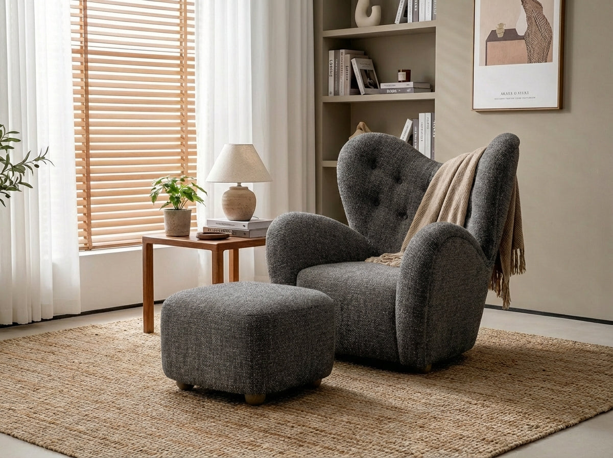 Relax in comfort and contemporary style with the Araco Atelier Teddy Armchair Cinder with Footstool, a modern lounge chair set designed for deep relaxation and refined interiors. Upholstered in sophisticated Cinder fabric, this armchair and matching footstool introduce a rich charcoal tone that adds bold depth and elegant contrast to modern living spaces.